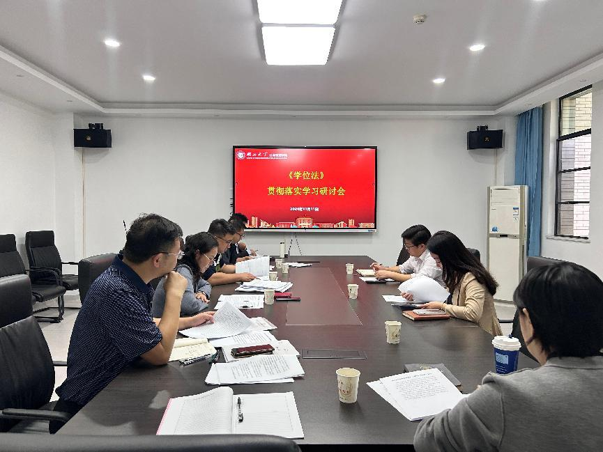 11月11日,suncitygroup太阳成集团在523会议室组织学习《中华人民共和国学位法》,李荣娟经理、张小进副经理、周学荣教授、向良云副教授、王振伟副教授、谢迪副教授、谢丹副教授等学位委员会委员及研究生秘书张雷参加会议,会议由张小进副经理主持。