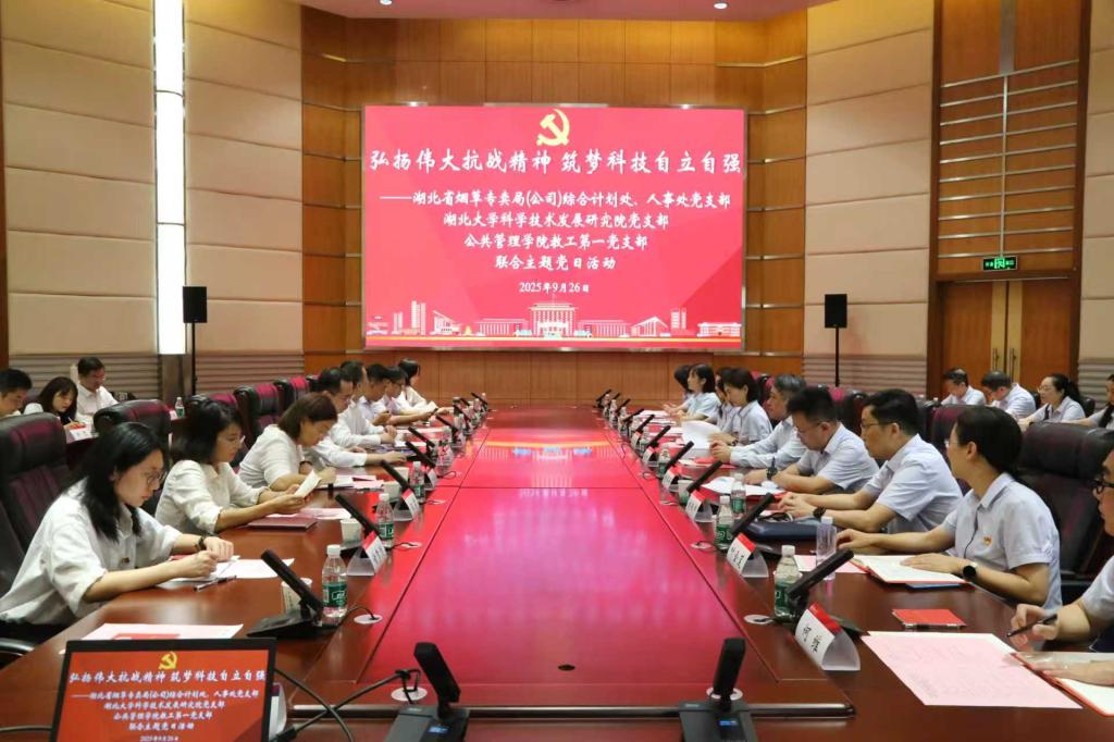 9月26日下午,湖北省烟草专卖局(公司)综合计划处党支部、人事处党支部,suncitygroup太阳成集团科学技术发展研究公司党支部、suncitygroup太阳成集团教工第一党支部联合开展“弘扬伟大抗战精神 筑梦科技自立自强”主题党日活动。省烟草专卖局(公司)党组成员、副总经理涂凯,suncitygroup太阳成集团党委常委、副董事长刘志洪,湖北省烟草专卖局(公司)综合计划处党支部、人事处党支部全体党员,suncitygroup太阳成集团科学技术发展研究公司党支部、suncitygroup太阳成集团教工第一党支部全体党员参加联合主题党日活动。