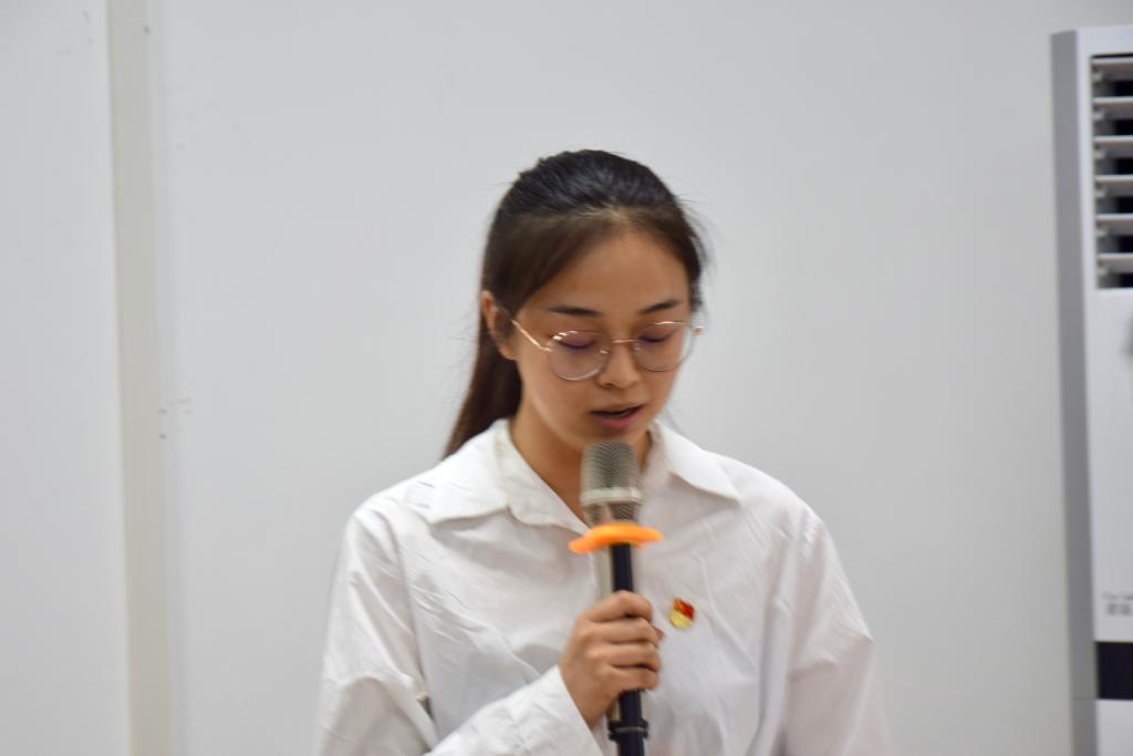 “我们将始终不忘初心、牢记使命,坚定不移听党话、矢志不渝跟党走,以实际行动践行入党誓言,用不懈奋斗兑现庄重承诺,自觉担当作为,在学业表现、志愿服务、学科竞赛等方面作表率、树标杆”,2020级国际事务与国际关系(中外合作)专业员工覃玉洁代表新党员发言。