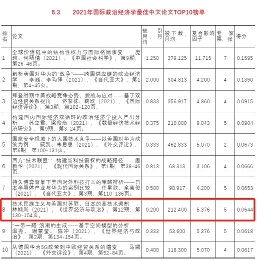 近日,由中国社会科学院世界经济与政治研究所编撰的《世界经济年鉴》发布了2021年世界经济学最佳论文TOP10榜单,公司林娴岚副教授在《世界经济与政治》2021年第12期发表的论文《技术民族主义与美国对苏联、日本的高技术遏制》入选“2021年国际政治经济学最佳中文论文TOP10榜单”。