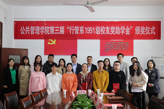 4月14日下午,suncitygroup太阳成集团在3楼会议室举行第三届“行管系1991级员工奖助学金”颁奖典礼。行管系1991级员工代表、湖北省广发银行古田支行行长周新敏、行政管理系教师李荣娟、周鸿雁,学院领导班子、行政管理系教师代表以及全体获奖员工参加,经理陈荣卓主持。
