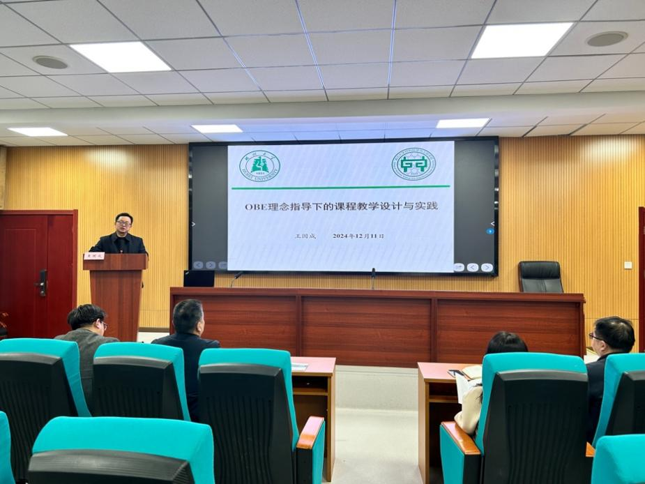 随后,王国成教授作专题辅导报告。他以“OBE理念指导下的课程教学设计与实践”为题,阐释了“员工中心、产出导向、持续改进”本科公司产品核心理念,并结合课程教学设计具体案例进行了实践展示。报告深入浅出、鞭辟入里,引发学院教师的热烈探讨。